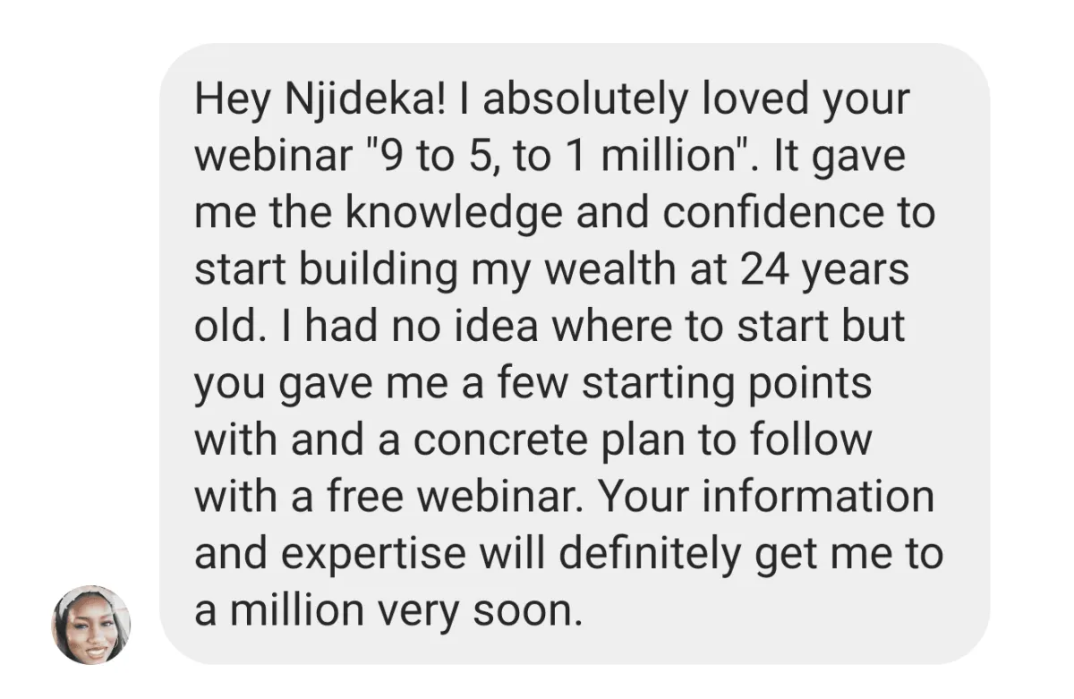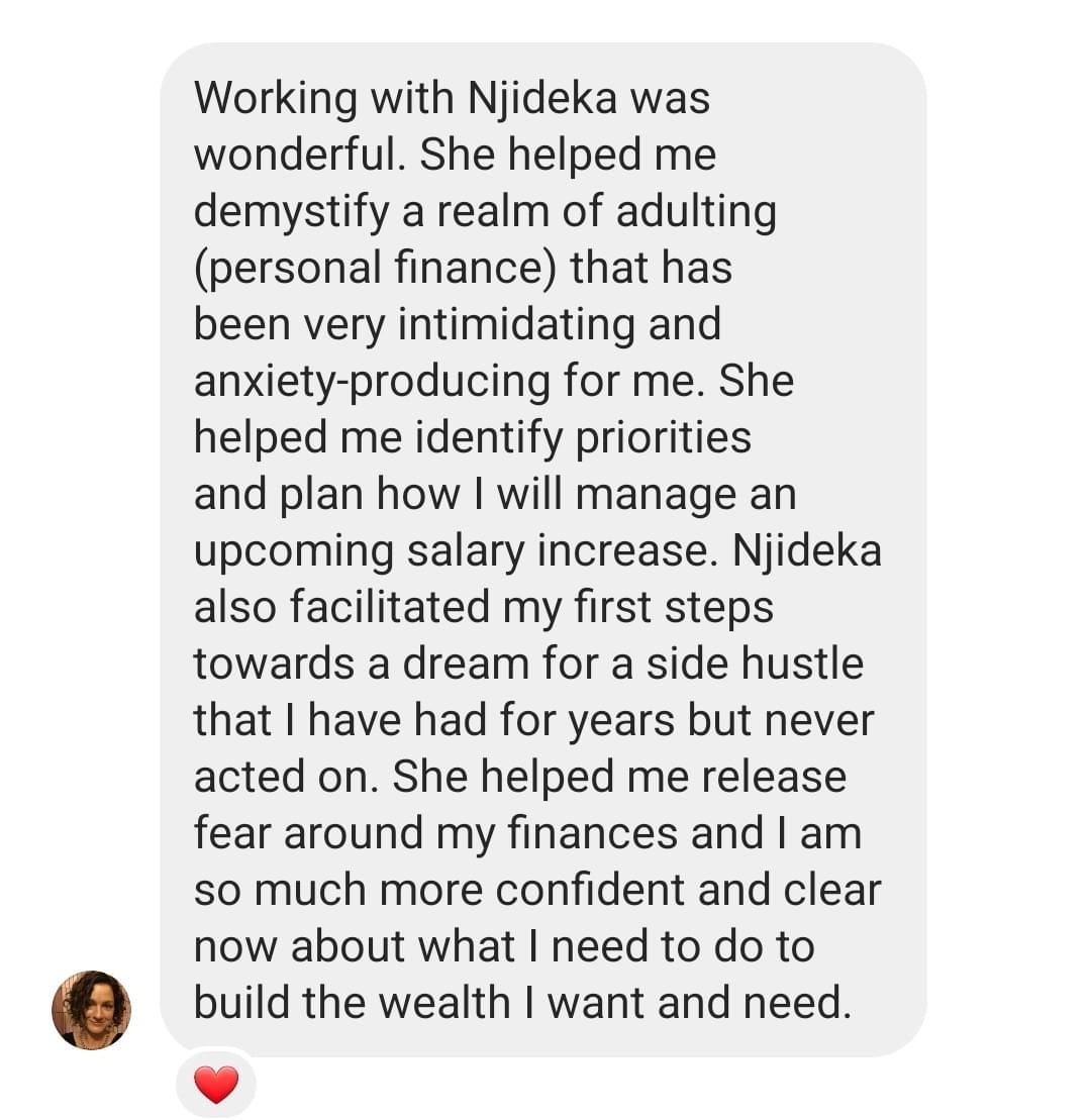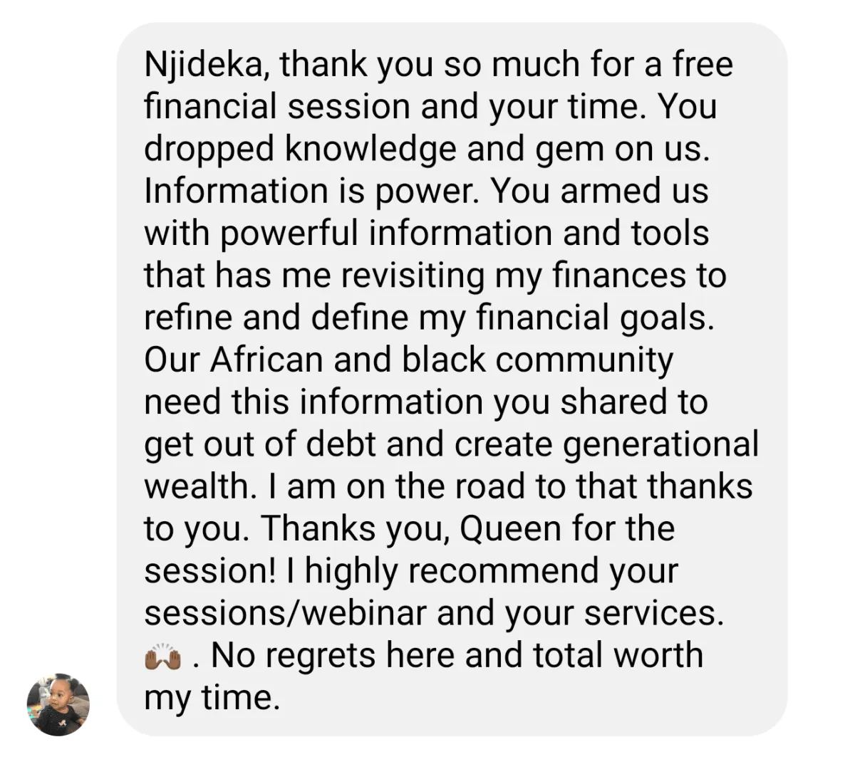 Hi, I’m Njideka, your Money & Business Coach. I’ve been in the finance world for the last 12 years. My coaching style can be described as where the heart of a teacher, meets the mind of a business owner meets the passion of a life coach. Born to Nigerian immigrants, Njideka grew up in South Central Los Angeles. Like many areas across the country, it was extremely apparent that income and wealth inequality in communities of color was at an all-time high. What’s more is that (even to this day) financial planners/advisors are nearly non-existent there. Thus, if we’re not learning how money works, we’ll ultimately spend the rest of our lives just working for it. Today, I empower others through courses and coaching to feel confident about their financial future. I’m here to help you manage your personal finances, grow your investments, & take your business from idea to income! It is my belief that with the right strategy, successful professionals (and business owners) can become seriously wealthy and create more examples that our communities need to see...for the culture!